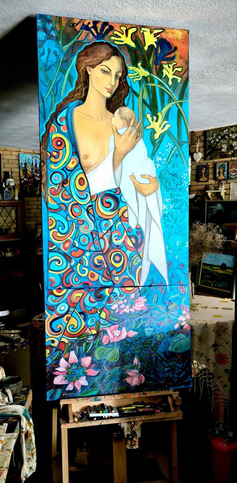 170×70, olej, akryl, pastel olejny. Zdjęcie nie oddaje walorów i działania pracy. Dwa panele: 120×70 i dolny 50×70. Na życzenie doślę zdjęcia detali.