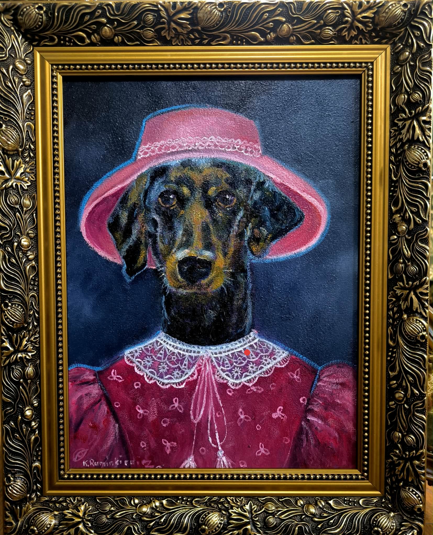 Jamniczka w kapeluszu, 40×30, oprawiony