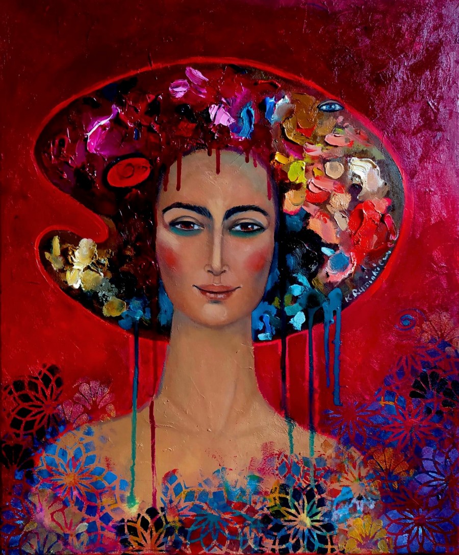 60×50, olej. Dialog z Mistrzami. Frida. Zdjęcie nie oddaje walorów pracy.